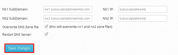 - Önemli! : Nameserver ekleme / güncelleme işleminin gerçekleşebilmesi için centos web panelinizde ekli olan ve ns1 ve ns2 alt dns güncellemesi domain tarafında yapılmış olan bir alan adınızın olması gerekmektedir. Alan adınız için bu kayıtları ve ns yönlendirmesini domain panelinizden yapmadı iseniz aşağıdaki işlem gerçekleşmez.