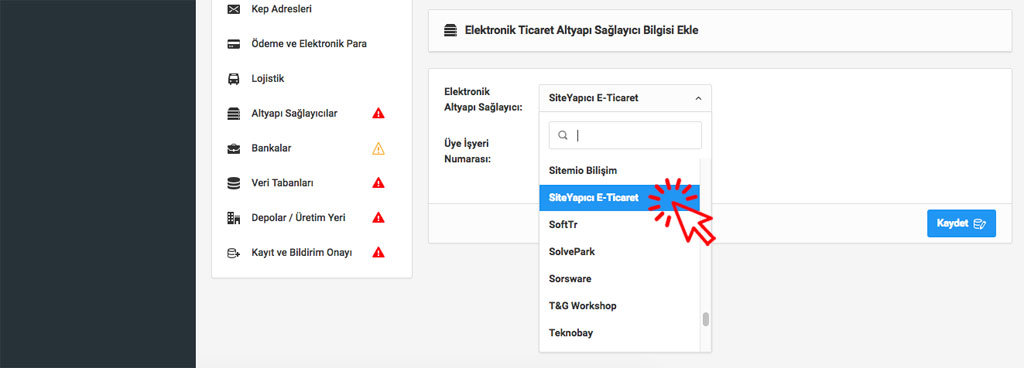Eğer bir ödeme aracılık firmasıyla çalışıyorsanız bu adımda listeden ilgili firmayı seçiniz. Örneğin İyzico, PayTR gibi birçok ödeme aracılık firması bu adımda seçilebilmektedir. Direkt olarak bankalarla çalışıyorsanız veya kredi kartı ödemeleri almıyorsanız Anlaşmam Bulunmamaktadır seçeneğini işaretleyiniz.