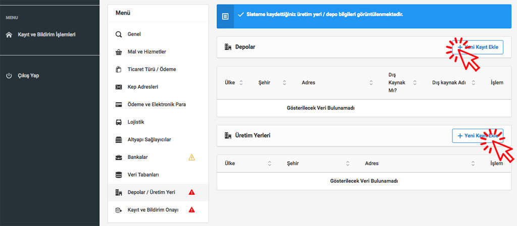 E-ticaret faaliyetiniz kapsamında depolarınız varsa ve üretimi kendi işletmeniz yapıyorsa, bu bilgileri Yeni Kayıt Ekle butonlarına basarak girebilirsiniz. Deponuz ve Üretim yeriniz yoksa, Yeni Kayıt ’a basıp Depom Bulunmamaktadır ve Üretim Yeri Bulunmamaktadır seçeneklerini işaretleyip kaydediniz.