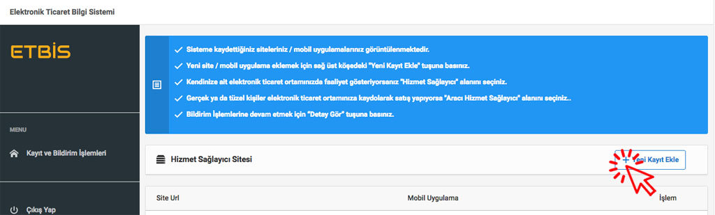 Eğer birden fazla e-ticaret siteniz varsa her site için ayrı ayrı ETBİS kaydı gerekmektedir. Baştaki hizmet sağlayıcı ekleme adımından yeni bir site adresi girerek aynı adımları tekrar etmek suretiyle diğer site veya mobil uygulamalarınızı da kaydedebilirsiniz.