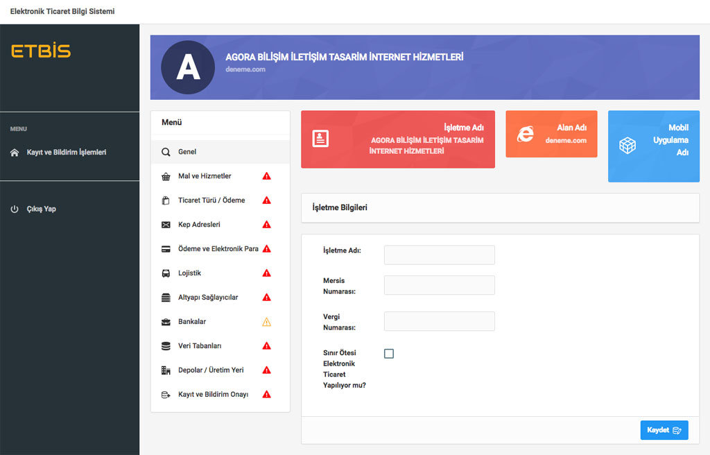 - Genel (İşletme Unvanı, MERSİS No, Vergi No)