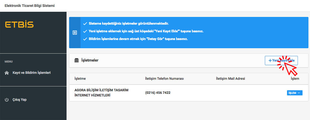 İlk adımda e-Devlet bilgilerinize bağlı MERSİS numarası bulunan işletmeleriniz ekrana gelecektir. Buradan işletmenizi seçip, mail adresi ve telefon numarasını yazarak devam ediniz. Daha önce ETBİS ’e kısmen kayıt ettiğiniz bir işletme varsa İŞLEM menüsünden detaylarını görüntüleyip eksik kalan adımları tamamlayabilirsiniz.