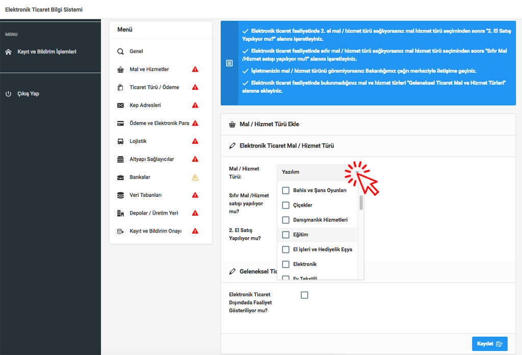 Açılan ekranda Yeni Kayıt Ekle butonuna basıp, Mal ve Hizmetler alanının yanındaki açılır menüden ana faaliyet alanlarınızı işaretleyin. Altında yeni veya 2. el ürün / hizmet satışı yapıp yapmadığınız ilgili kutucukları işaretleyerek belirleyin.