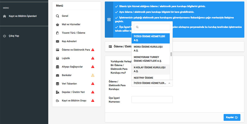- Anlaşmalı Ödeme Aracılık Kuruluşu Bildirimi (İyzico, PayTR, iPara vb.)