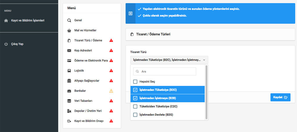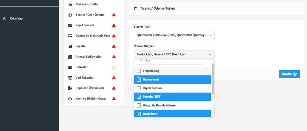 Bu adımda B2C (İşletmeden son kullanıcıya), B2B (işletmeden işletmeye) gibi ticaret türlerini ve kabul ettiğiniz ödeme yöntemlerini (Kredi Kartı, Banka Havalesi, Kapıda Ödeme vb.) belirtiyoruz.