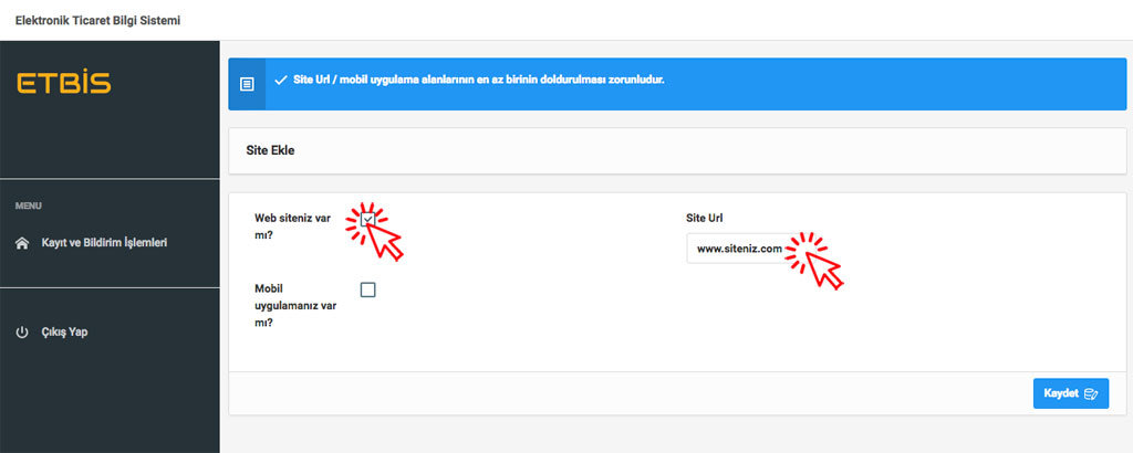 E-ticaret faaliyeti yürüttüğünüz web sitesinin adresini (URL) ve eğer varsa Mobil Uygulamanızın adını yazıp kayıt ediniz.