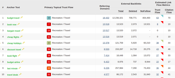 Yine odaklanmanız gereken önemli nokta; anchor metin dağılımı. Bu işin kuralı, ilk ondaki anchor metinlere göz atmak. Bu ilk ondaki anchor metinler spesifik ürün ve servisler için optimize edilmişlerse, yakın zamanda PageRank ilişkili bir link çalışması yapılmış demektir. Bu da, risk var anlamına gelir! Bu riskin analizi için yine Majestic ve Ahrefs gibi araçlar kullanarak derinlikli bir inceleme yapabilirsiniz. Tüm anchor metinlere değil de, sadece ilk ondakine bakılmasının nedeni yine anchor metnin niteliğiyle ilgilidir. Ticari amaçlı anchor metinler hep üst sıralarda kendini gösterir.