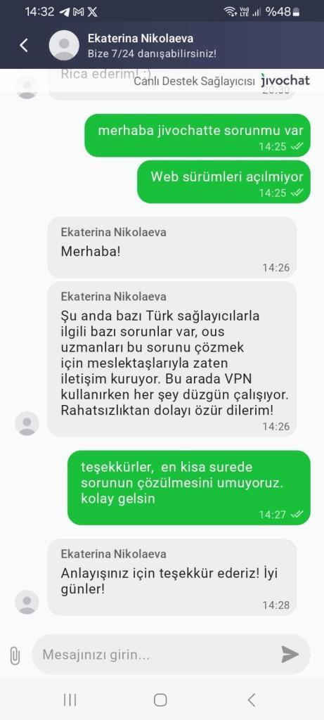 Türkiye içinden jivochat.com ve jivochat.com.tr sitelerine girilmediğini fark edince mobil uygulamasını açarak canlı destek ile görüştüm gelen cevap aşağıdaki gibidir;