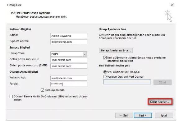 Açılan penceredeki kutucukları aşağıdaki şekilde dolduruyor ve Diğer Ayarlar bölümüne tıklıyoruz