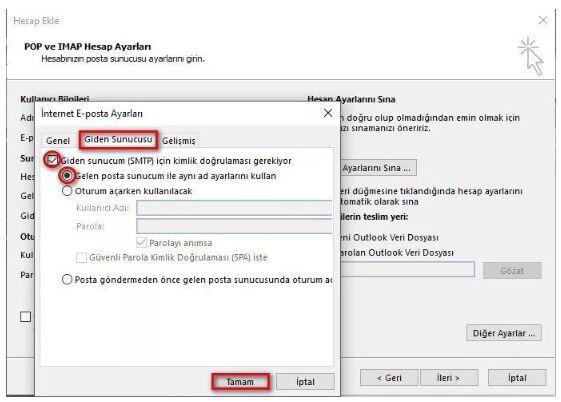 Aynı pencerede Giden sekmesine tıklıyor, “Giden sunucum (SMTP)için kimlik doğrulaması gerekiyor” seçeneğini ve “Gelen posta sunucum ile aynı ad ayarlarını kullan” kutucuklarını işaretliyoruz