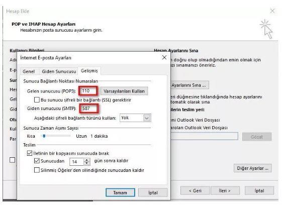 Açılan pencerede Gelişmiş sekmesine tıklıyor, gelen ve giden sunucu numaralarını 110 ve 587 olacak şekilde ayarlıyoruz. İletinin bir kopyasını sunucuda bırak seçeneğini işaretliyor ve ne kadar süre sonra sunucudan silinmesi istediğimizi belirterek tamam butonuna tıklıyoruz. Sunucudaki postaların silinmesi bilgisayarınızdaki postaların silineceği anlamına gelmez. Bu işlem hosting depolama alanınızı düzenli temizleyecektir.
