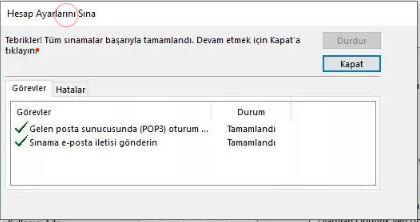 İleri butonuna tıklıyoruz ve hesap ayarlarını sına kutucuğu açılıyor. Tüm işlemleri doğru yaptıysak sınama başarılı olduğu bilgisi geliyor ve mailimiz kullanıma hazırdır